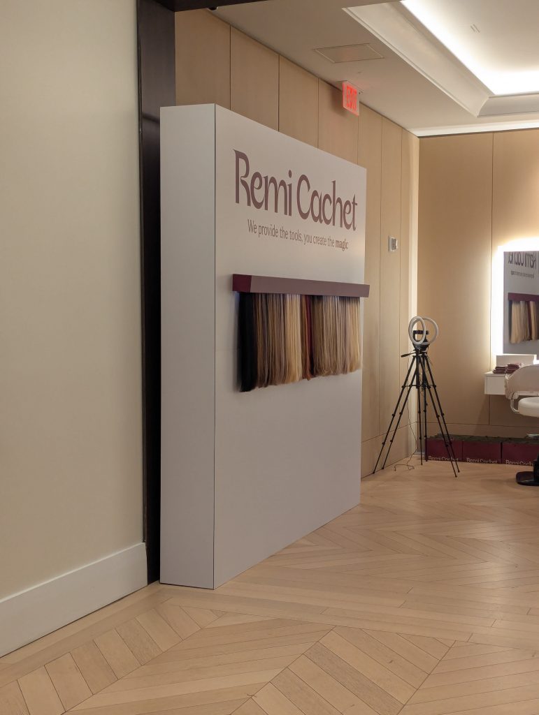 Our mission? To design and build a custom installation that didn’t just display their premium hair extensions but celebrated them. Here is a behind-the-scenes look at how we produced a custom 8×8 Hard Wall Backdrop complete with a mounted hair extension display rack, lighting, and a full red-carpet experience.
