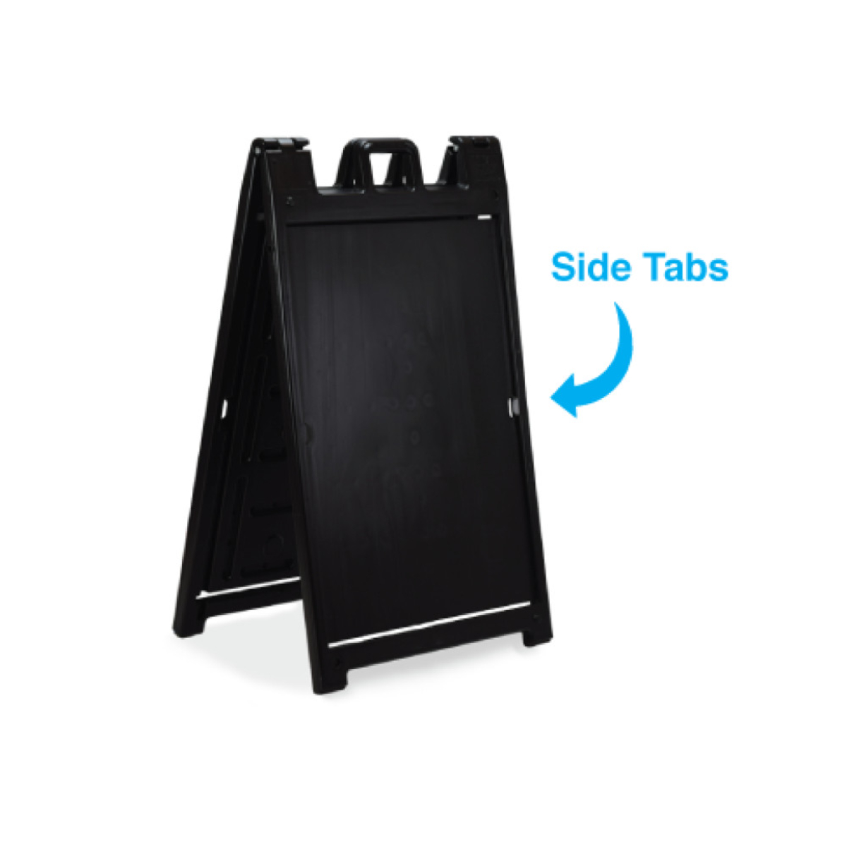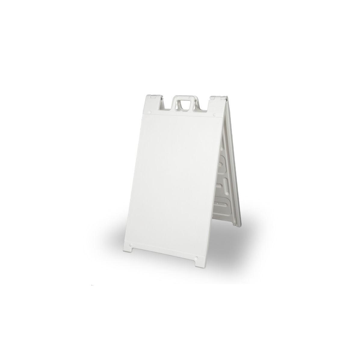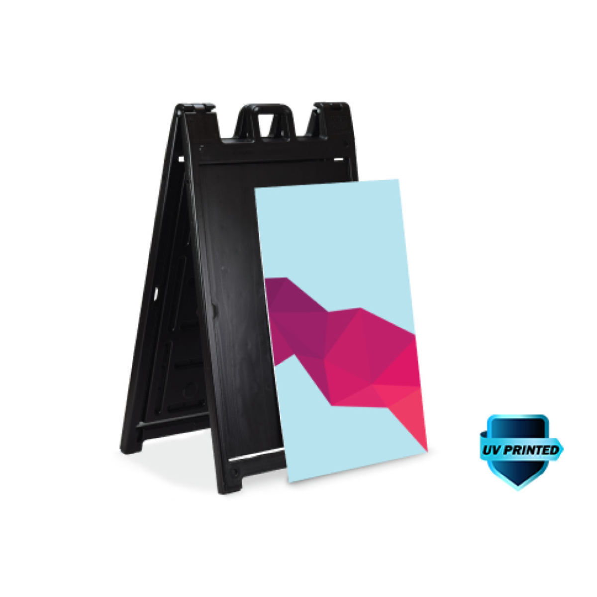 This heavy-duty plastic A-frame is the perfect solution for sidewalk advertising. The frame can be filled with sand or water for greater stability. The hardware includes recessed sign areas that help to protect the vinyl sign faces. Available single sided (front graphic) or double sided (graphics front and back), prints are UV printed on adhesive vinyl and mounted to the Signicade before shipping.