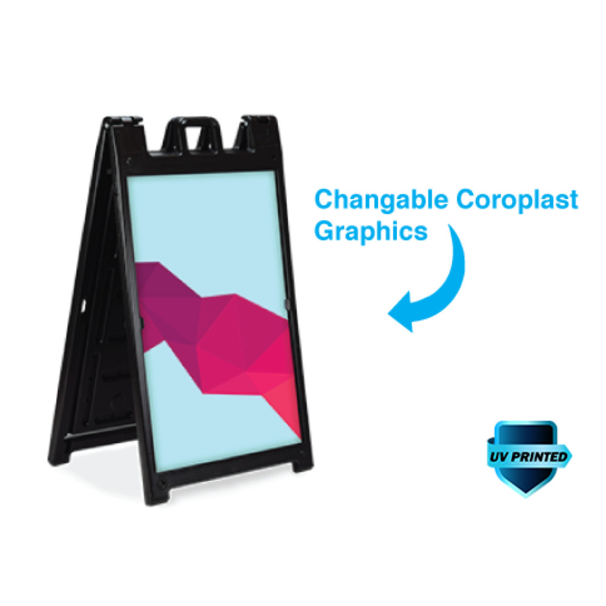 Signicade Deluxe allows swapping out rigid inserts as often as you need. Our graphics are full-color UV direct printed coroplast for a long-lasting durable matte print.